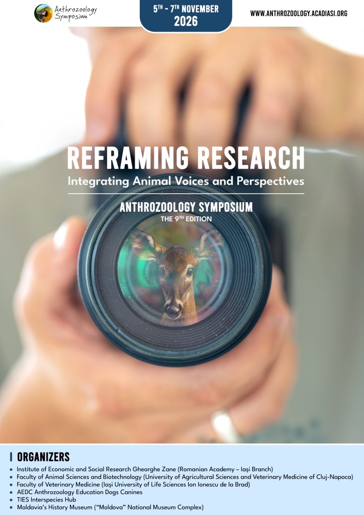 We invite you to take part to the Anthrozoology Symposium, Ninth Edition, Reframing Research: lntegrating Animal Voices and Perspectives, organized by the Gheorghe Zone Institute for Economic and Social Research (Romanian Academy, laşi Branch), in association with the Faculty of Animal Sciences and Biotechnology (University of Agricultural Sciences and Veterinary Medicine of Cluj-Napoca), the Faculty of Veterinarian Medicine (,,Ion Ionescu de la Brad” University of Life Sciences of laşi), AEDC Anthrozoology Education Dogs Canines, TIES lnterspecies Hub and Moldavia’s History Museum (“Moldova” National Museum Complex).